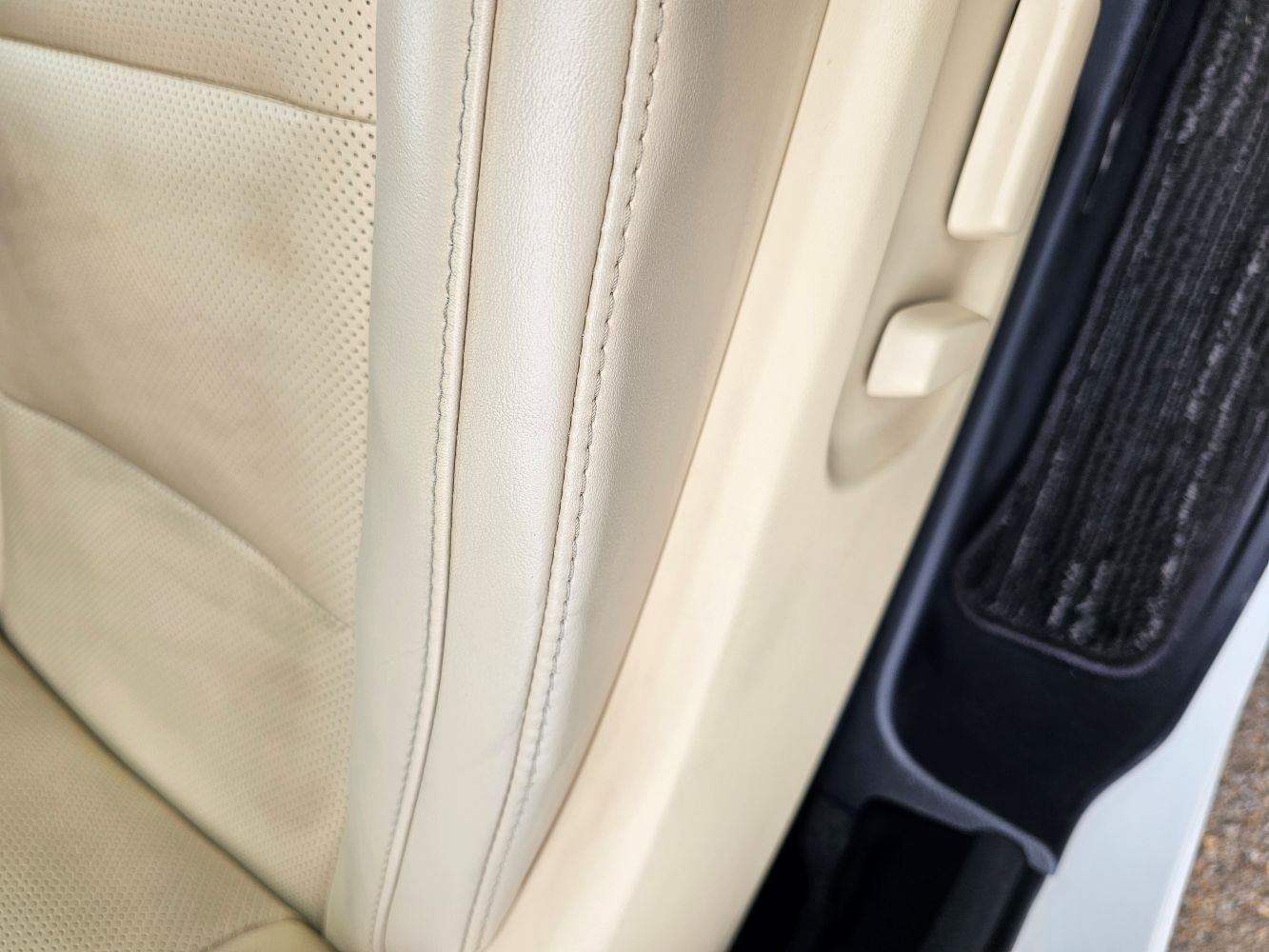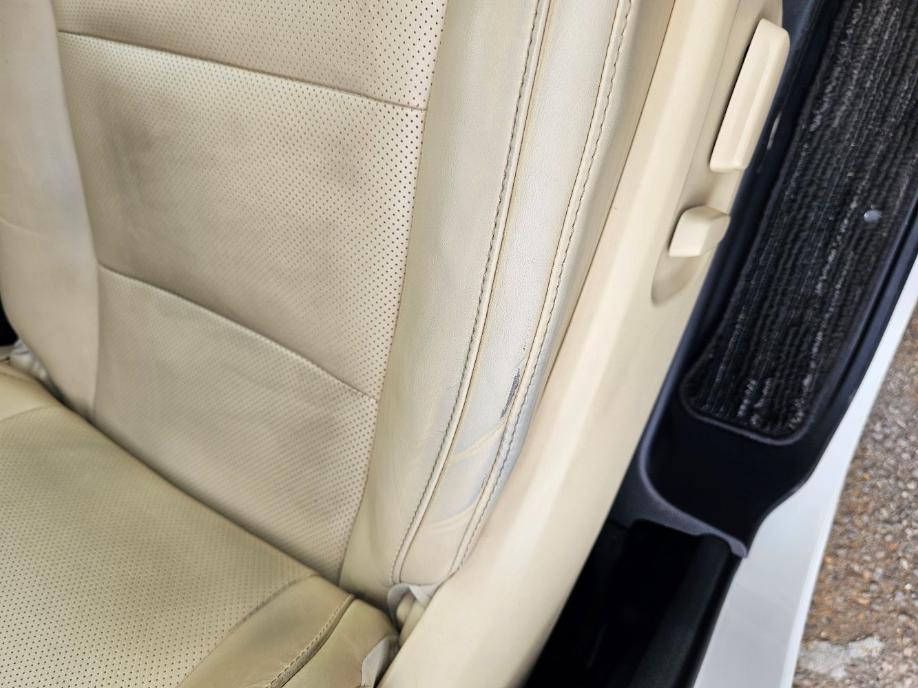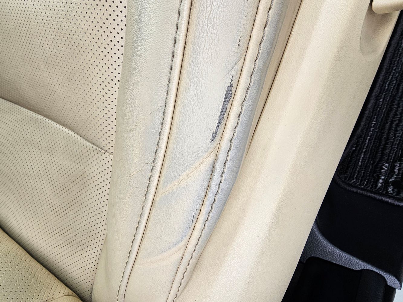 かなり使用感のあるベージュレザーシートです。破れそうな部分とシワ部分の
