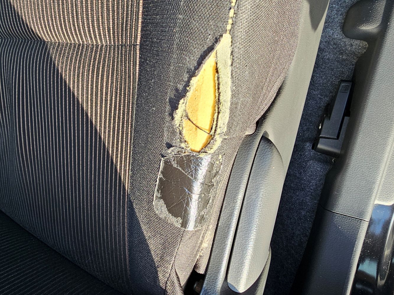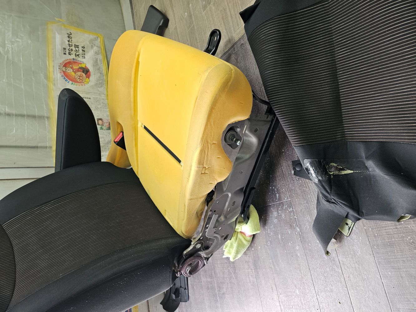 車両からシートを取り外しシートを分解し表皮を交換です。幸いにも内部のウレタンは